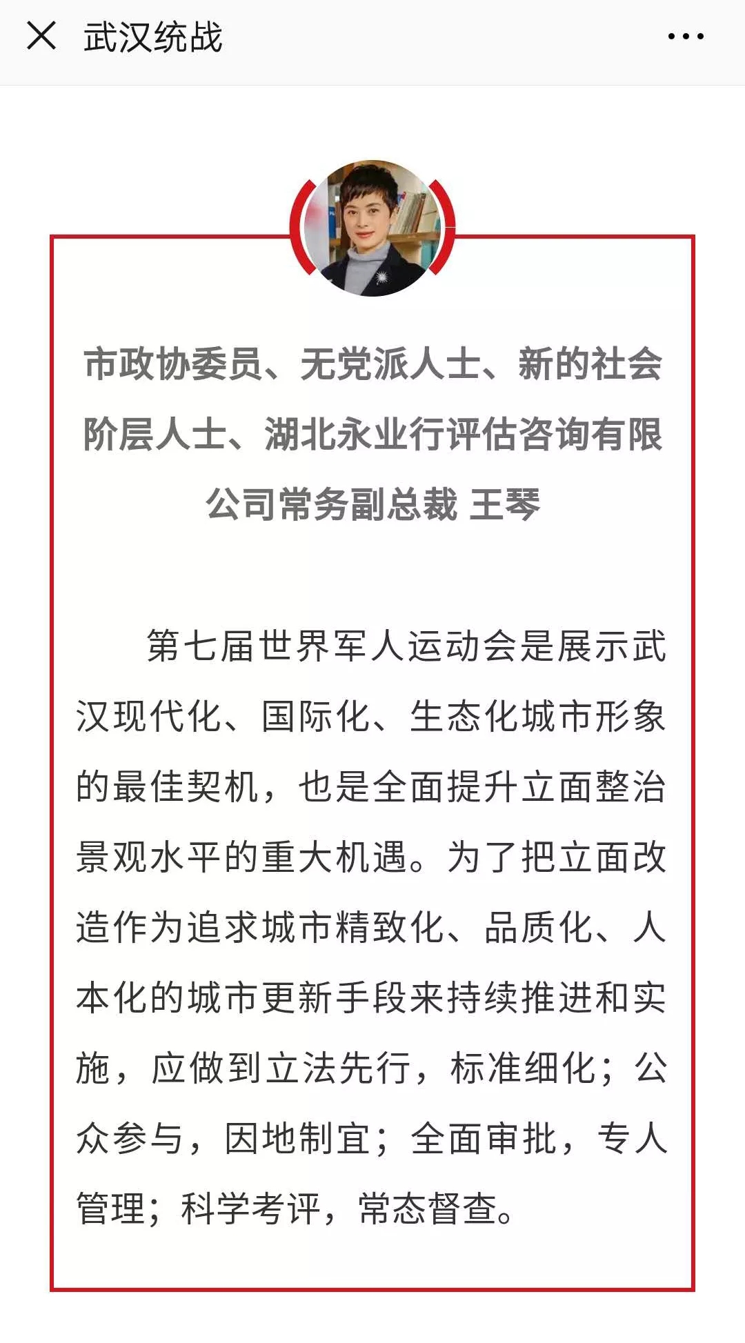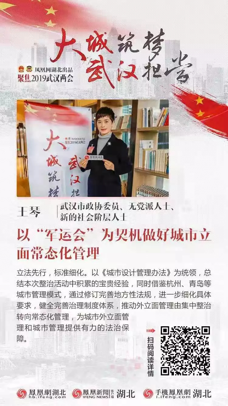 6日,武汉市委书记、市长周先旺与市政协委员协商座谈,听取委员对《政府工作报告》和政府工作的意见建议。王琴委员以《以“军运会”为契机做好城市立面常态化管理》为主题进行了发言,针对武汉市城管委启动的军运会保障线路户外广告、门面招牌规范提升工作,建议从立法先行,标准细化;公众参与,因地制宜;全面审批,专人管理;科学考评,常态督查等四方面建立长效机制,把立面改造作为追求城市精致化、品质化、人本化的城市更新手段来持续推进和实施。周先旺认真听取和记录,充分肯定了王琴等委员的建言,并表示市政府将照单全收、认真吸纳,充分用好这些“金点子”,更好推动武汉高质量发展,努力让政协委员满意、让全市人民满意。