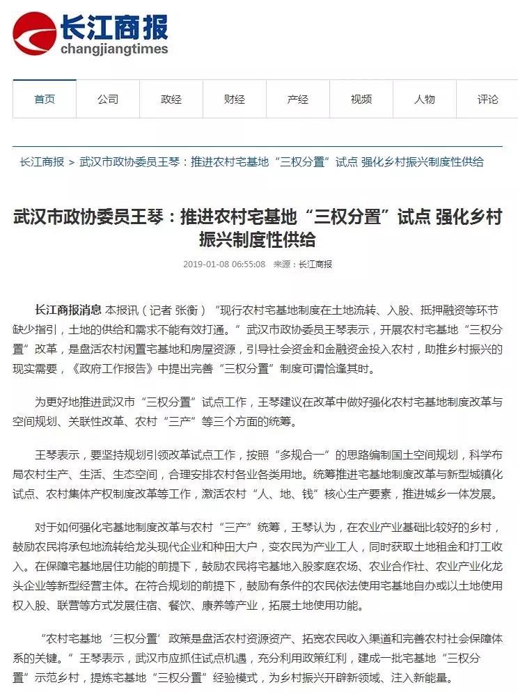 2019年1月4日至8日,政协武汉市第十三届委员会第三次会议在汉召开。武汉市政协委员、永业行常务副总裁王琴向大会提交了《 以“军运会”为契机做好城市立面常态化管理》、《推进农村宅基地“三权分置”试点 强化乡村振兴制度性供给》、《关于武汉市推进氢能汽车产业发展的建议》三份提案。连日来,这些关乎民生的提案受到各大媒体的普遍关注,凤凰网、长江商报、武汉电视台、武汉新闻广播等多家媒体对此进行了报道。