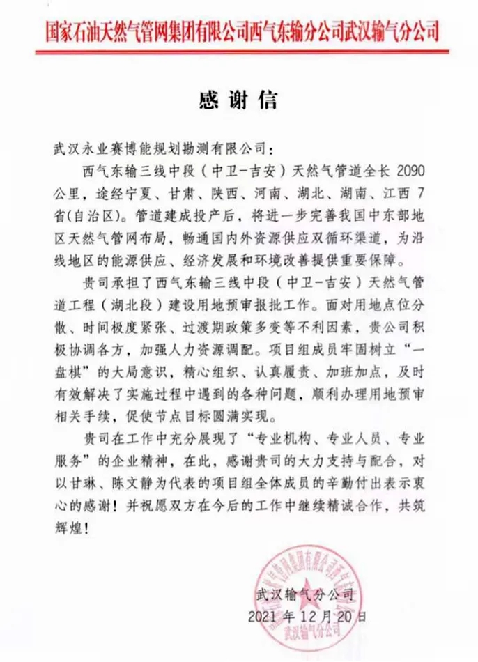 2021年12月20日,国家石油天然气管网集团有限公司(下称“国家管网公司”)西气东输分公司武汉输气分公司致函永业行,对我司承担的西气东输三线中段(中卫-吉安)天然气管道工程(湖北段)建设用地预审工作给予肯定和感谢。