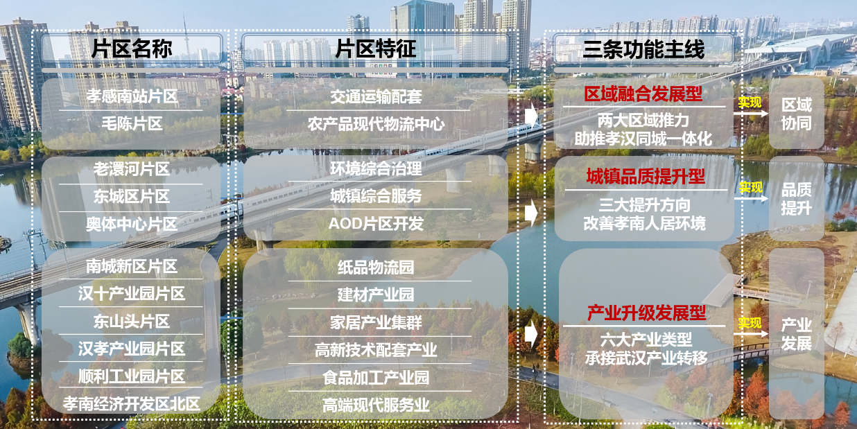 《方案》以“综合开发,高效利用”为目的,通过对存量空间的“填充式开发”,推动“产-城-人”协调发展。以区域协同、品质提升和产业发展为切入点,提出区域融合发展型、城镇品质提升型、产业升级发展型三条功能主线。在此基础上形成“2+3+6”的十一个成片开发片区有效地保障了孝南区建设项目落地,为孝南“南城突起、两带支撑、孝汉融合、多点发力”的发展战略实施提供了有力的支撑。