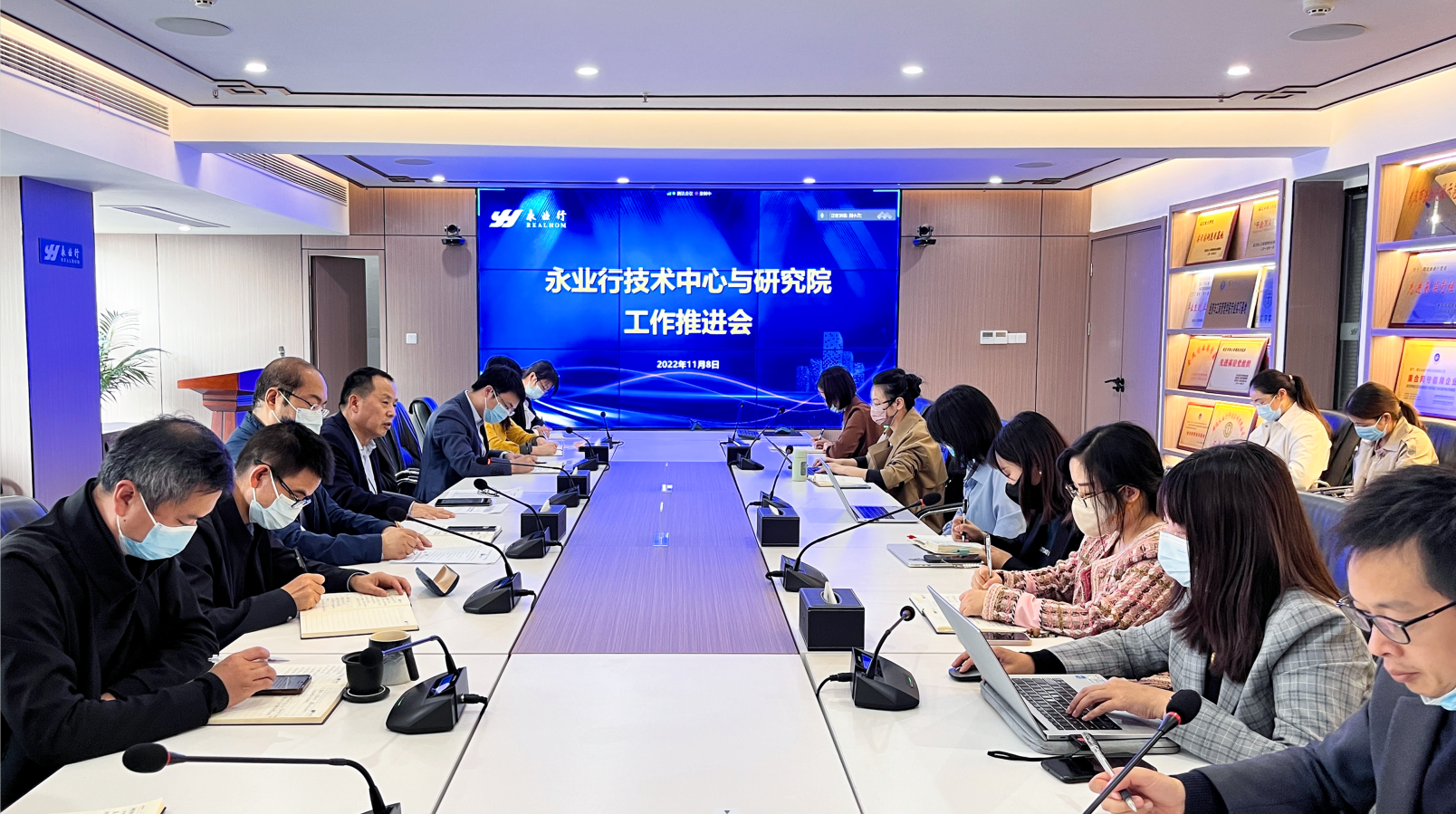 2022年11月8日,永业行召开技术中心与研究院改革工作推进会,解读永业行技术管理与研发改革方案,宣读技术中心、研究院人事任命文件,并就技术管理与研发改革工作推进进行交流。董事长潘世炳、常务副总裁吴学锋、高级副总裁文云波,组织人事部总监孙慧、技术中心与研究院全体成员通过线上和线下形式参加会议。