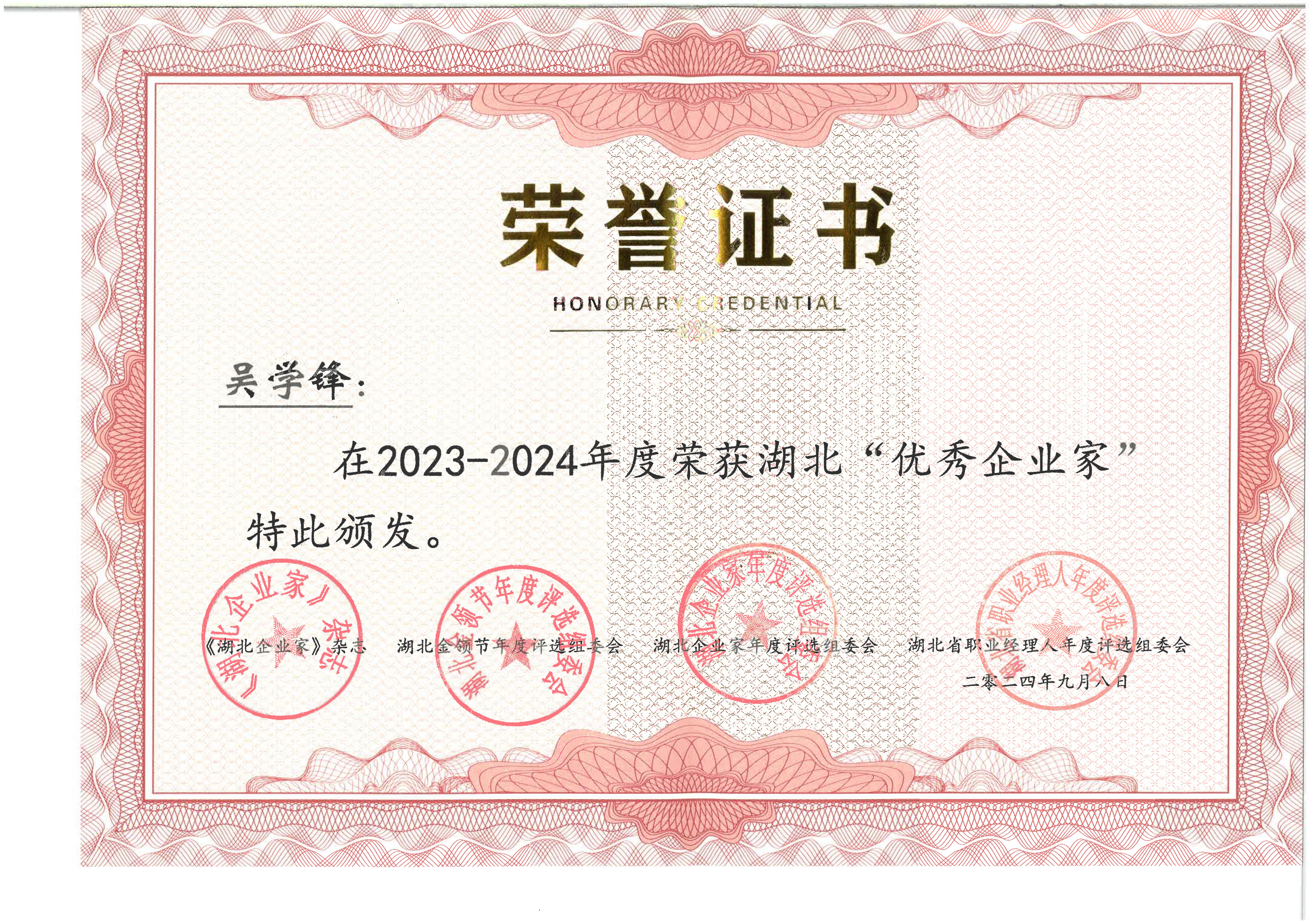 吴学锋荣获2023-2024年度湖北“优秀企业家”