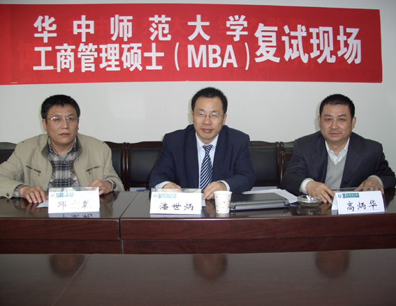 4月10日,应华中师范大学经济管理学院邀请,永业行总裁潘世炳博士担任该院MBA(工商管理硕士)入学复试评委,并担任第一组组长。今年是华中师范大学首次招收MBA,计划招收MBA120-150名。图为华中师范大学经济管理学院院长邓宏乾教授(左1)、高炳华教授(右1)在复试现场。