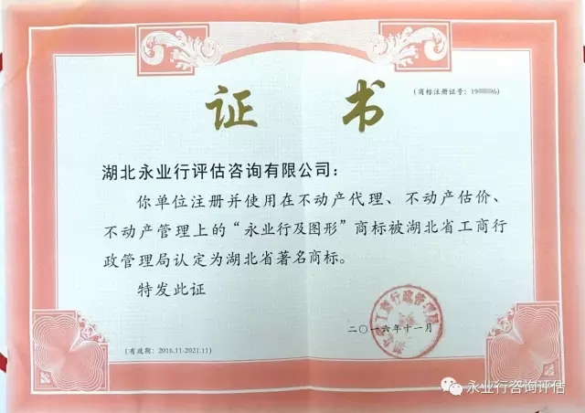 作为湖北省评估行业首家获得省、市级著名商标的企业,永业行历来十分重视商标使用、管理和保护等工作,组建了严密的商标管理组织架构,注册了涵盖不动产评估咨询等29大类的"永业行"服务类注册商标,注重保护商标专用权,维护商标信誉,先后两次被认定为湖北省、武汉市著名商标。