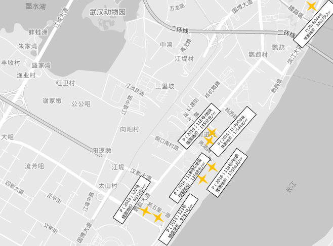 近三年,汉阳滨江区域共出让4宗地块,上宗地块出让追溯到2016年P(2016)118号地块,由平安竞得,楼面地价13588元/㎡,溢价率65%。P(2016)118号地块由F、G、J、K四宗地块组成,由中建、越秀、金茂、龙湖联合开发。2016年出让的另外一宗地块为P(2016)064号,2016年创下武汉市单价地王的地块,由碧桂园竞得,楼面地价为20017元/㎡。