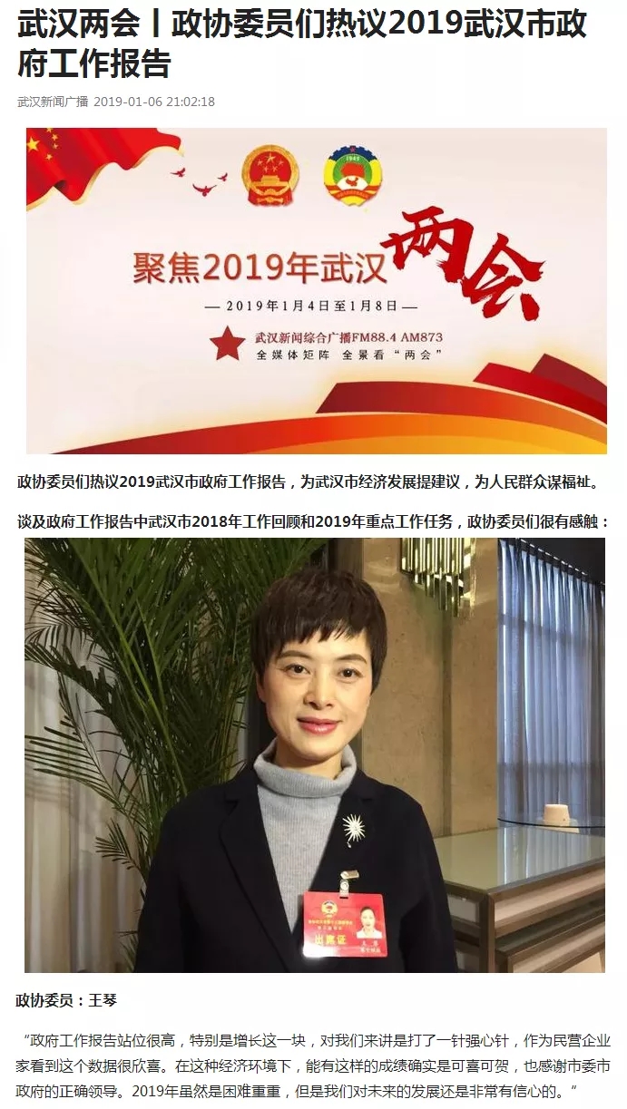 2019年1月4日至8日,政协武汉市第十三届委员会第三次会议在汉召开。武汉市政协委员、永业行常务副总裁王琴向大会提交了《 以“军运会”为契机做好城市立面常态化管理》、《推进农村宅基地“三权分置”试点 强化乡村振兴制度性供给》、《关于武汉市推进氢能汽车产业发展的建议》三份提案。连日来,这些关乎民生的提案受到各大媒体的普遍关注,凤凰网、长江商报、武汉电视台、武汉新闻广播等多家媒体对此进行了报道。