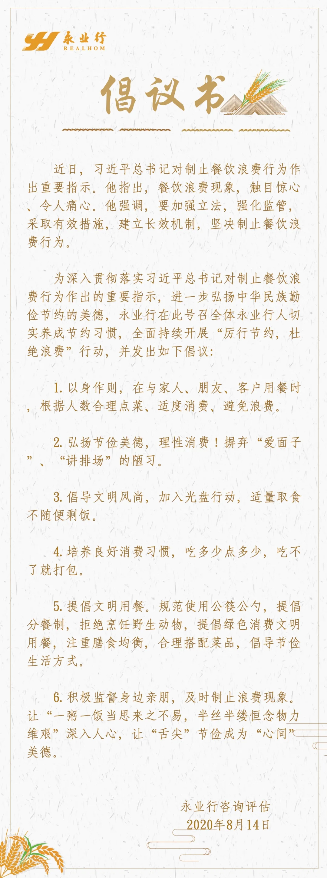 永业行关于“坚决制止餐饮浪费行为”的倡议书