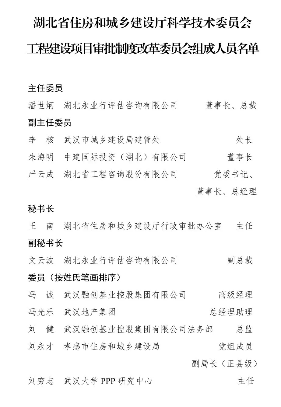 9月30日,省住房和城乡建设厅发布《关于成立湖北省住房和城乡建设厅科学技术委员会历史文化名城等四个专业委员会的通知》,公布了住房和城乡建设厅科学技术委员会历史文化名城、质量安全、工程建设项目审批制度改革、智慧住建等四个专业委员会委员名单,省房协会长、永业行董事长、总裁潘世炳获聘为工程建设项目审批制度改革委员会主任委员,武汉市城乡建设局建管处处长李核、中建国际投资(湖北)有限公司董事长朱海明、湖北省工程咨询股份有限公司党委书记、董事长、总经理严云成获聘为副主任委员,湖北省住房和城乡建设厅行政审批办公室主任王南、省村镇建设协会副理事长、永业行副总裁文云波分别获聘为秘书长、副秘书长。