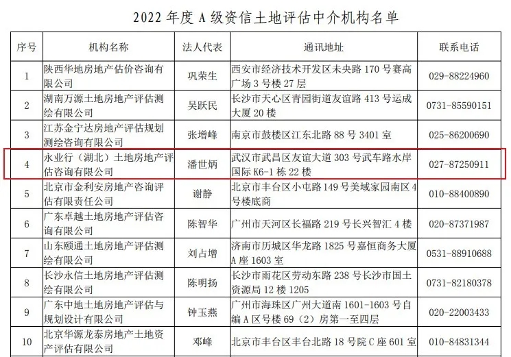 全国第四,湖北第一!永业行再获“A级资信土地评估中介机构”称号
