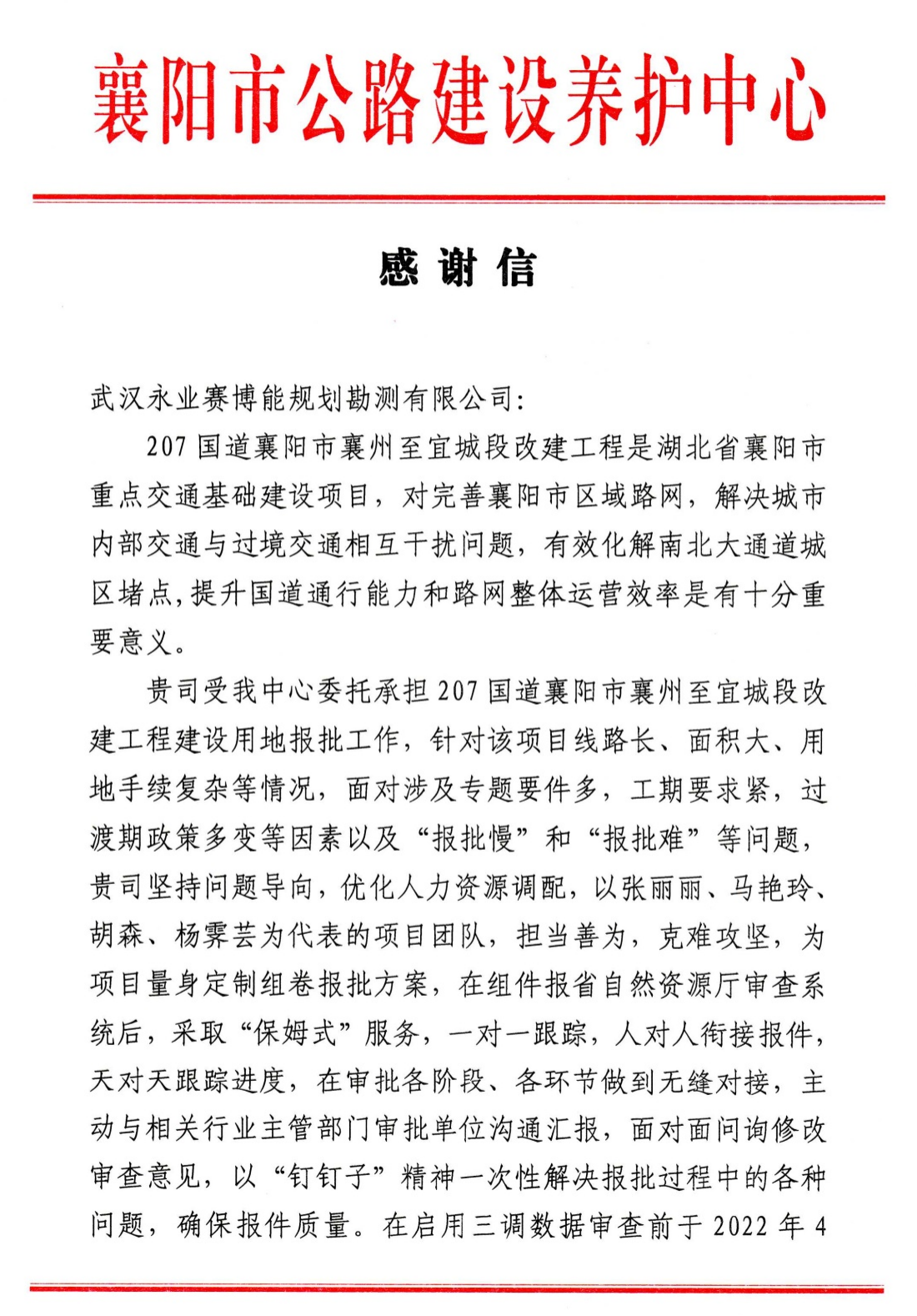 2022年7月27日,襄阳市公路建设养护中心致函永业行,对我司承担的207国道襄阳市襄州至宜城段改建工程建设用地报批工作给予肯定和感谢。