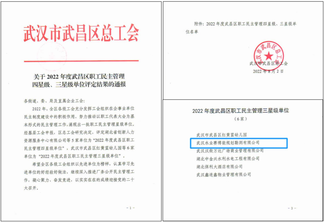 近日,武汉市武昌区总工会发布 《关于2022年度武昌区职工民主管理四星级、三星级单位评定结果的通报》,永业行获评“2022年度武昌区职工民主管理三星级单位”。