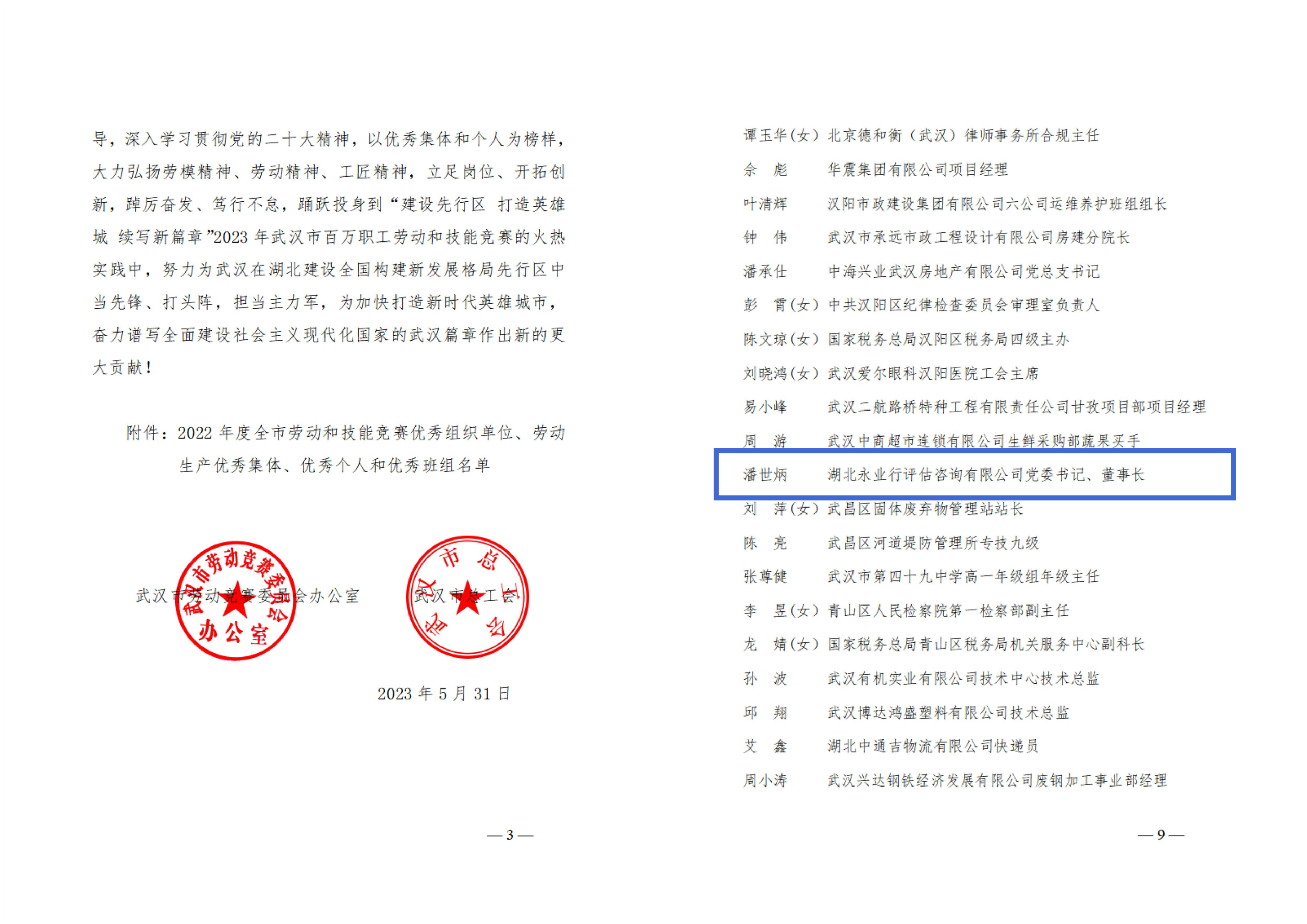 近日,武汉市劳动竞赛委员会办公室、武汉市总工会对全市19个2022年劳动和技能竞赛优秀组织单位、35个优秀集体、266个优秀个人、267个优秀班组予以通报,同时对劳动生产优秀集体、优秀个人和优秀班组分别选授为武汉五一劳动奖状、武汉五一劳动奖章、武汉市工人先锋号。其中,永业行党委书记、董事长潘世炳被授予“武汉五一劳动奖章”。