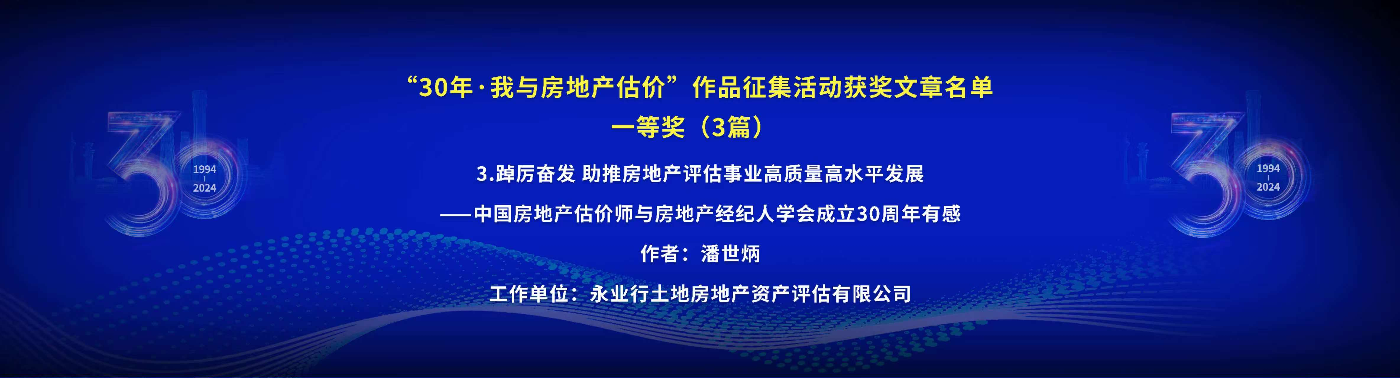 在同期开展的“30 年・我与房地产估价”永业行征集活动中,永业行积极响应并踊跃投稿,喜获佳绩,提报的四篇论文全部入选《中国房地产估价 30 年文集(征文)》。其中,由永业行党委书记、董事长潘世炳撰写的《踔厉奋发 助推房地产评估事业高质量高水平发展 —— 中国房地产估价师与房地产经纪人学会成立 30 周年有感》荣获一等奖。文中不仅回顾了房地产估价行业从萌芽到发展壮大的艰辛历程,更展望了未来通过深化创新、加速数字化转型以及强化内部治理等举措,推动行业持续繁荣的美好愿景,字里行间洋溢着对行业的深厚情感与坚定信心。