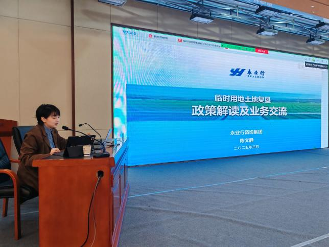 陈文静从临时用地政策背景及法规要点切入,系统解析了用地审批流程、复垦验收标准、权责边界划分等核心环节,结合永业行多年服务省级重点项目实践经验,通过典型案例剖析,深入阐述临时用地管理中的常见难点及风险防控策略。针对企业关注的政策分析、难点痛点、复垦验收等问题,她提出“政策+技术+服务”全链条解决方案,建议项目单位提前谋划合规路径、强化过程管控、拓宽资源整合渠道,确保用地管理规范高效。