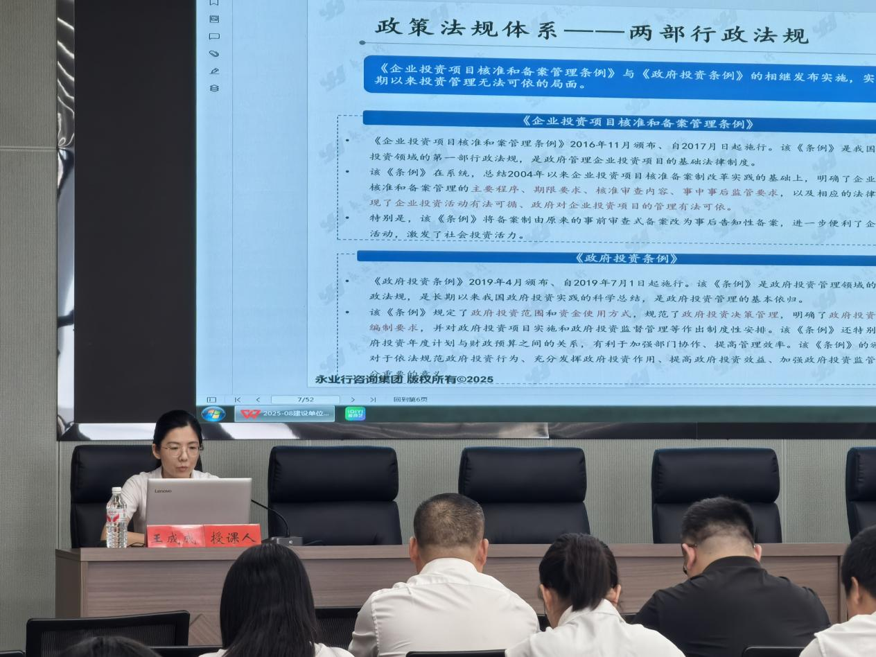 2025年8月15日,潜江市高新技术产业投资开发有限公司(下称“潜江市高新投”)举办2025年干部素质提升培训会。潜江市高新投党委副书记从政、副总经理郭雄出席会议。永业行投资金融事业群工程咨询事业部总监王成成受邀作《政府投资项目的全流程管理及实操解析》专题培训交流。